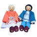 O Kit é composto de um casal de bonecos de madeira. Vestidos com roupas de tecido colorido. Os membros são articulados permitindo ficar em pé ou sentados. Os cabelos são de lã. Olhos e boca são pintados de forma estilizada.