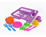Acompanha esponjinha e kit com escorredor, panelinhas, pratos, copos e talhares